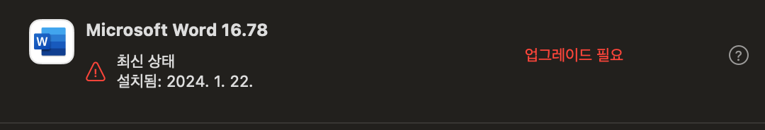 언젠가부터 Mac용 오피스의 자동 업데이트를 할 때, 워드만 업데이트가 되지 않고, '업그레이드 필요' 경고만 뜨는 현상이 있었다. 그냥 그런가보다 했는데, 다른 PC에서는 또 잘 되는걸 보며 뭔가 문제가 있다고 판단했다.