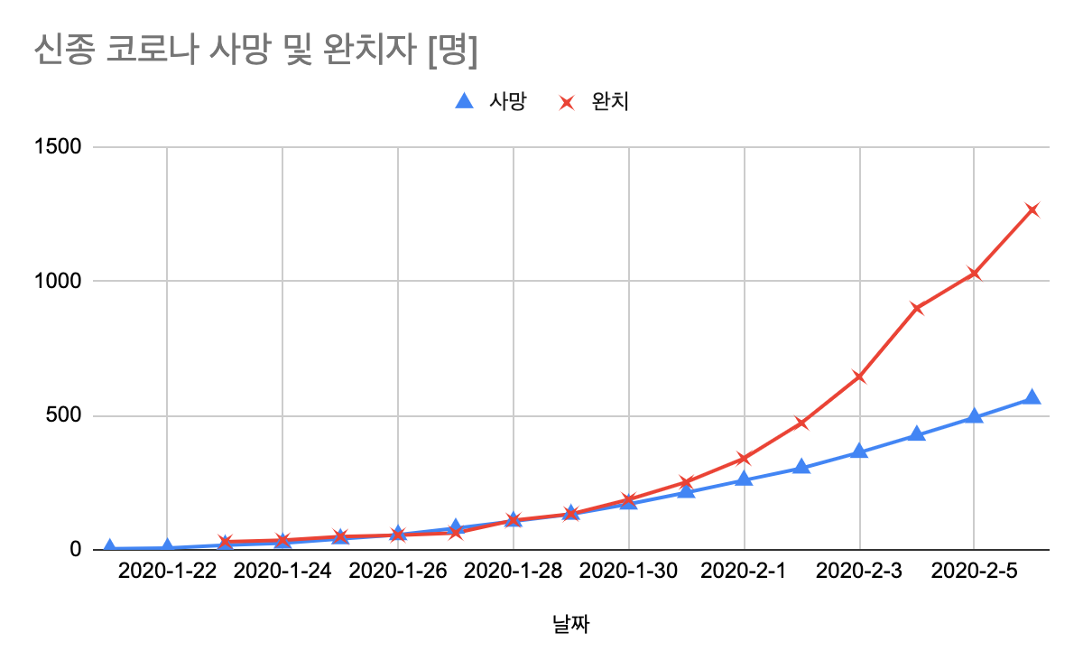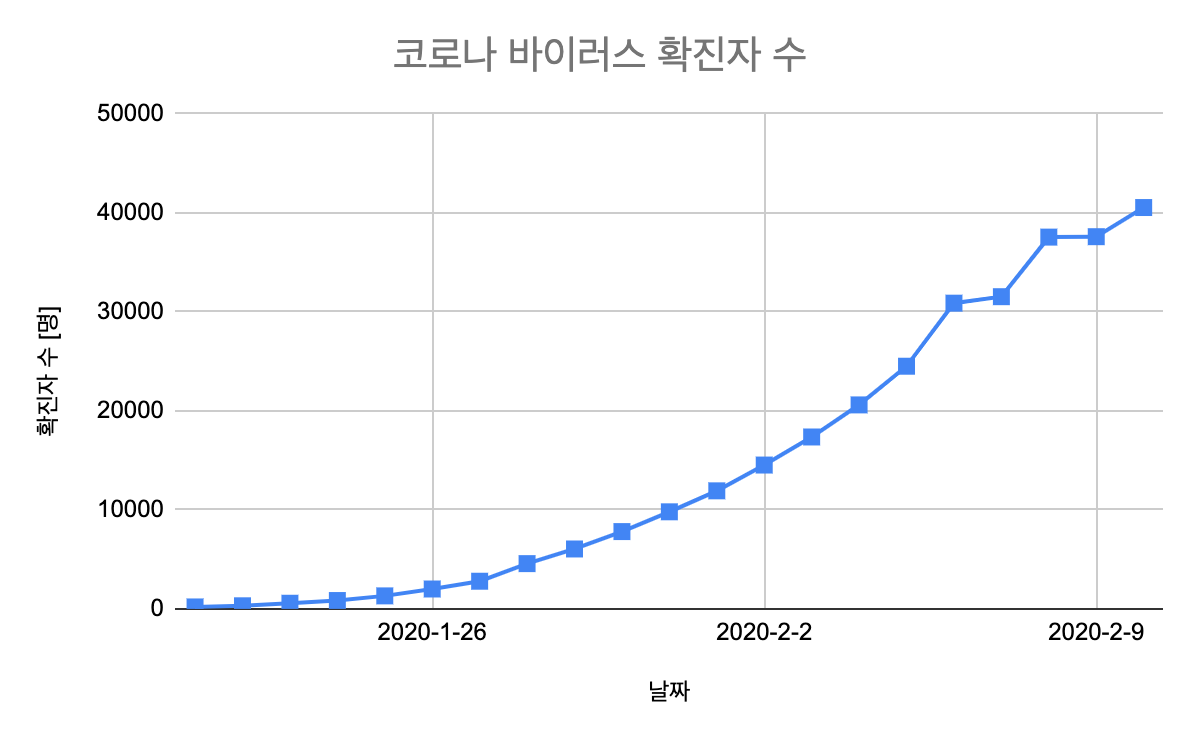- 위 그래프를 보면 초반에는 (약 2월 4~5일 까지) 지수함수의 형태를 나타내는 것을 알 수 있음
