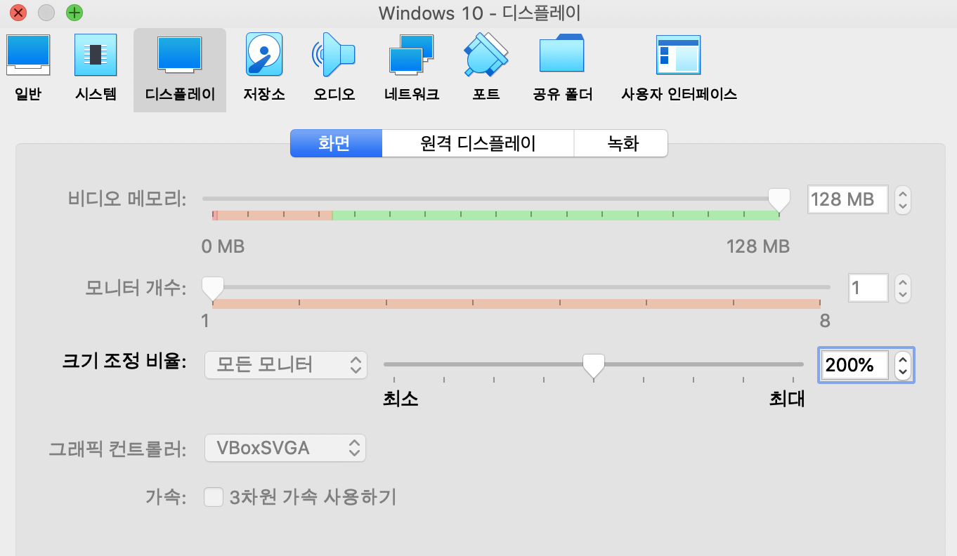 - (2)의 설정은 Windows 머신의 설정 -> 디스플레이 -> 크기조정비율 슬라이드 바를 찾아 200%로 맞추면 됩니다. (아래 그림 참조)