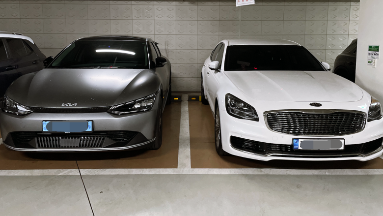 왼쪽이 ev6, 오른쪽이 기존에 타던 차량 +)