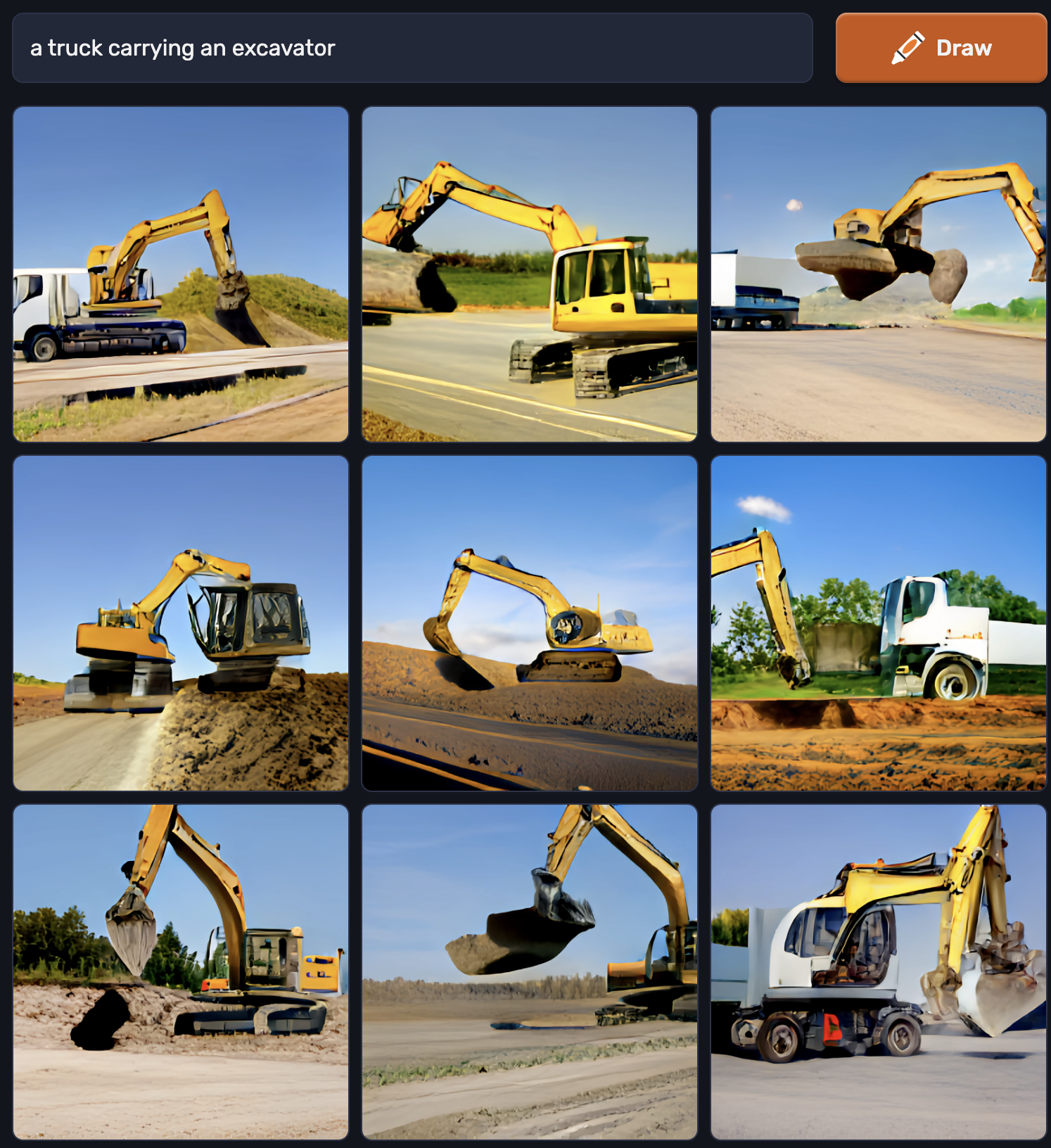 아빠의 사투의 흔적들 요즘 아들이 밀고 있는 '디거 업은 덤프트럭 그려주세요' (덤프트럭이 아니라 flat-bed truck이라고 해야하는데 아직 잘 모르는듯) 를 AI로 시켜보니 다음처럼 나온다. 9개 중에 두개 정도가 아들 마음에 들듯.